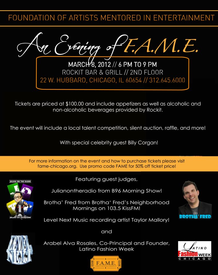 Come out and support a great cause, F.A.M.E., Foundation of Artist Mentored in Entertainment, founded by my agent, Lily Liu of LTA, Lily’s Talent Agency!! Special guests include Julian from J and Julian in the Morning on B96, Brotha’ Fred from Brotha’ Fred’s Neighborhood KISS FM, and my personal favorite, as he is a friend, Taylor Mallory, from Level Next Music!!